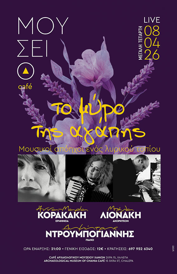στο Καφέ του Αρχαιολογικού Μουσείου Χανίων, τρεις ξεχωριστοί καλλιτέχνες συναντιούνται επί σκηνής για να δημιουργήσουν ένα λυρικό τοπίο γεμάτο μνήμη, συμβολισμούς και μουσική ευαισθησία.