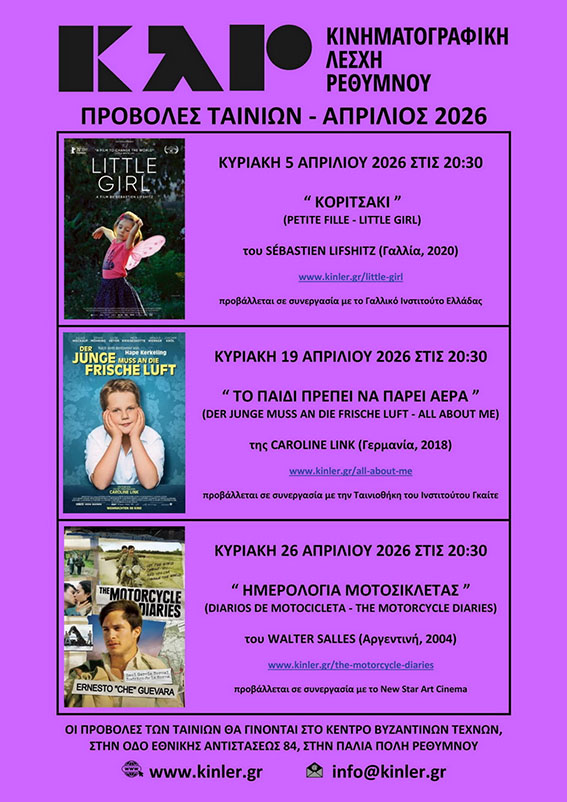 στις 20:30, στο Κέντρο Βυζαντινών Τεχνών, στην οδό Εθνικής Αντιστάσεως 84, στην παλιά πόλη του Ρεθύμνου, παρουσιάζοντας την ταινία «Το παιδί πρέπει να πάρει αέρα» (Der Junge muss an die frische Luft).