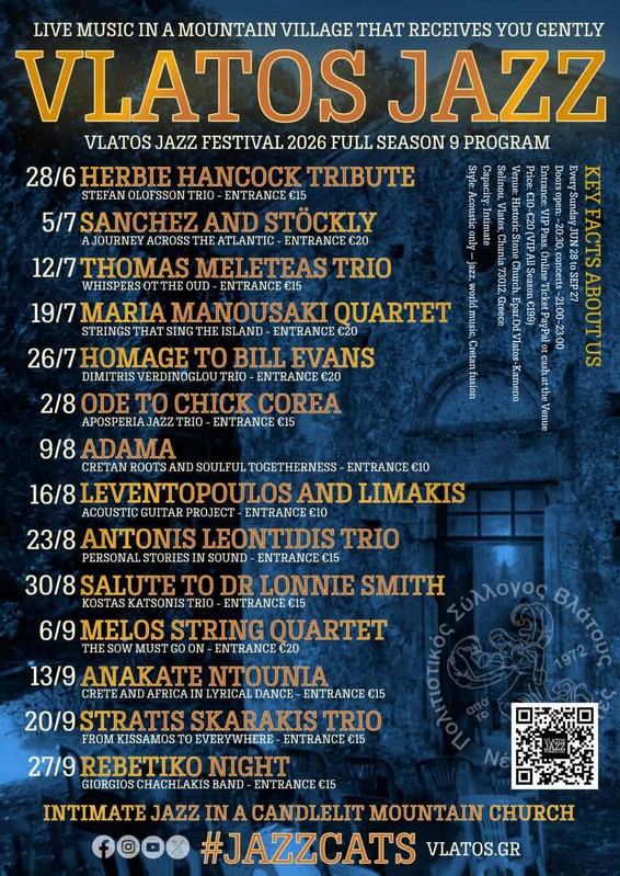 Το Vlatos Jazz Festival επιστρέφει το καλοκαίρι του 2026 με ένα πλούσιο και πολυδιάστατο πρόγραμμα, μετατρέποντας το ορεινό χωριό Βλάτος στα Χανιά σε έναν μοναδικό προορισμό για τους φίλους της jazz και όχι μόνο. Από τις