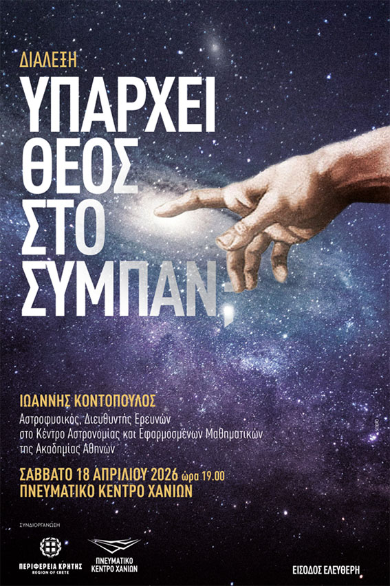 Το Πνευματικό Κέντρο Χανίων, σε συνδιοργάνωση με την Περιφέρεια Κρήτης – Περιφερειακή Ενότητα Χανίων, παρουσιάζει την ομιλία με τίτλο «Υπάρχει Θεός στο Σύμπαν;», το