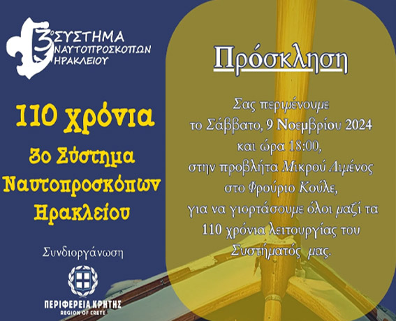 Το 3ο Σύστημα Ναυτοπροσκόπων Ηρακλείου συμπληρώνει φέτος 110 παρουσίας στην πόλη του Ηρακλείου. Στα πλαίσια της ιστορικής αυτής χρονιάς, σε συνδιοργάνωση με την Περιφέρεια Κρήτης