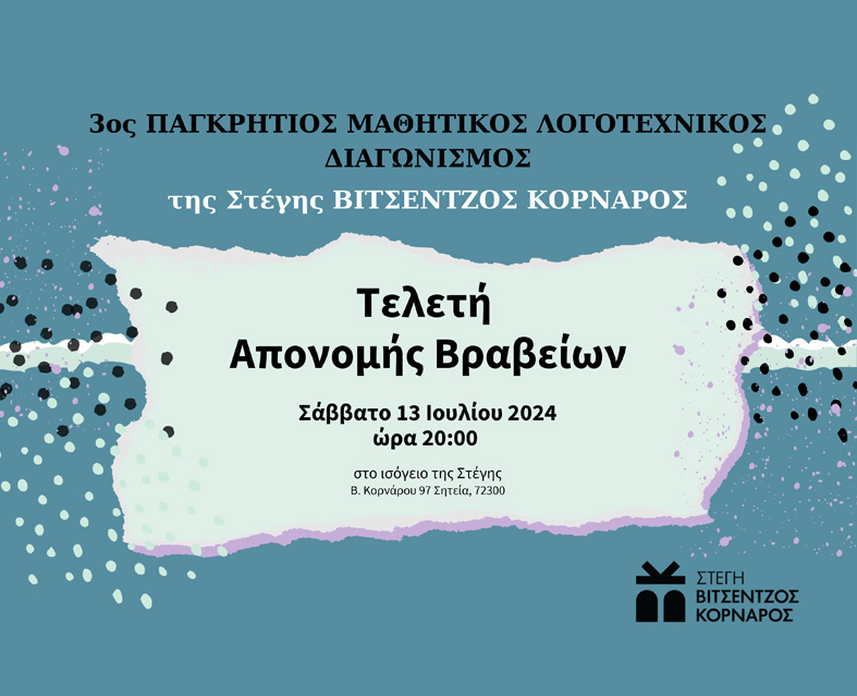 Σάββατο 13 Ιουλίου 2024 στις 20:00, στο ισόγειο της Στέγης, Β. Κορνάρου 97 Σητεία, 72300.