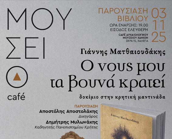 Παρουσίαση του δοκιμίου «Ο νους μου τα βουνά κρατεί» του Γιάννη Ματθαιουδάκη στο Καφέ του Αρχαιολογικού Μουσείου Χανίων